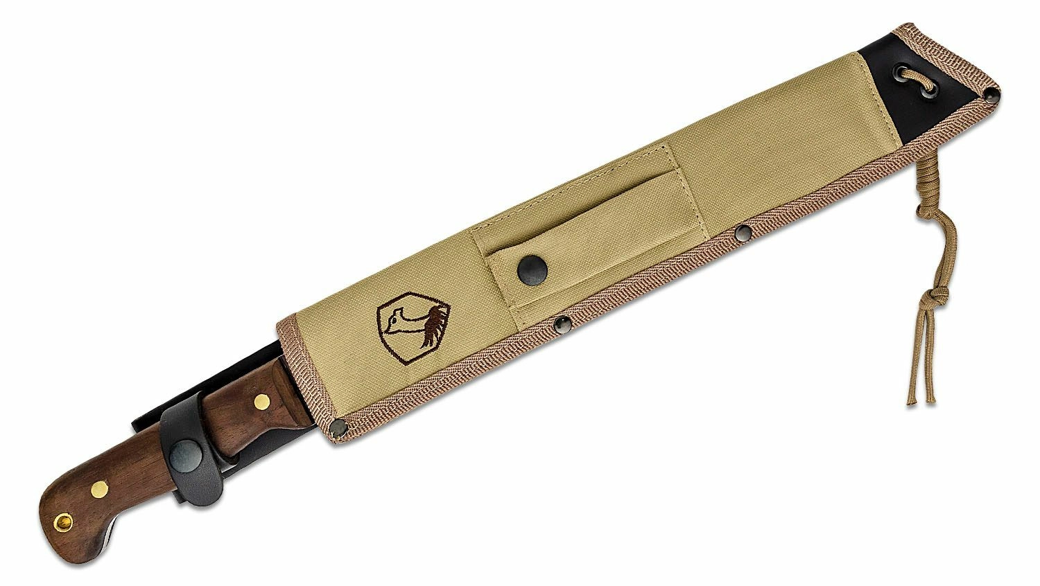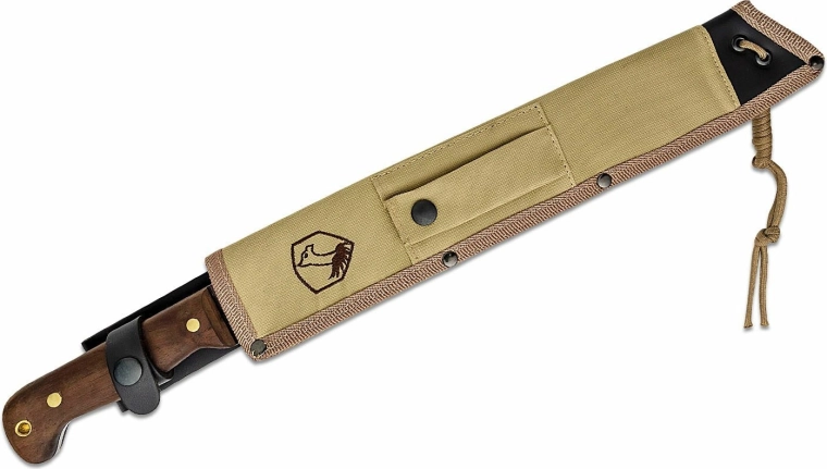 A csomag része egy minőségi vászontok bőr hurkokkal az övre akasztáshoz, így a machete mindig kéznél van. A katonai mintát követő hagyományos kialakítás jól állja a sarat zord körülmények között és a mindennapi kerti használatban is.