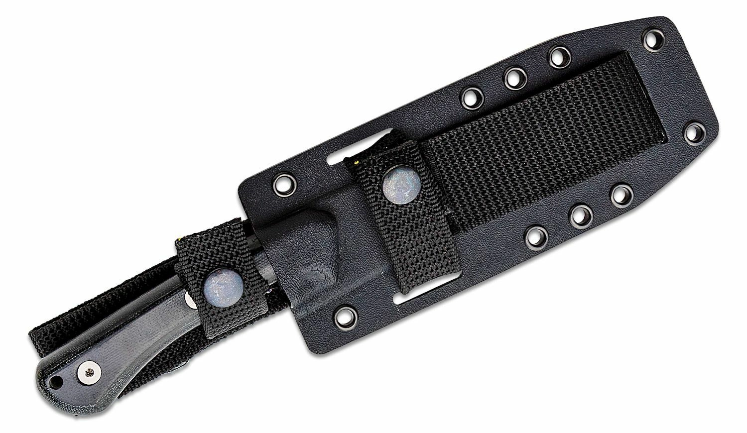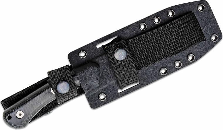 Az ergonomikusan formált, fekete Micarta markolat biztos fogást nyújt még nehéz körülmények között is. A markolat végén praktikus nyílás található zsinór vagy felfüggesztés számára. A csomag része a masszív Kydex tok, amely MOLLE rendszerrel kompatibilis, így rugalmasan rögzíthető a felszerelésre.