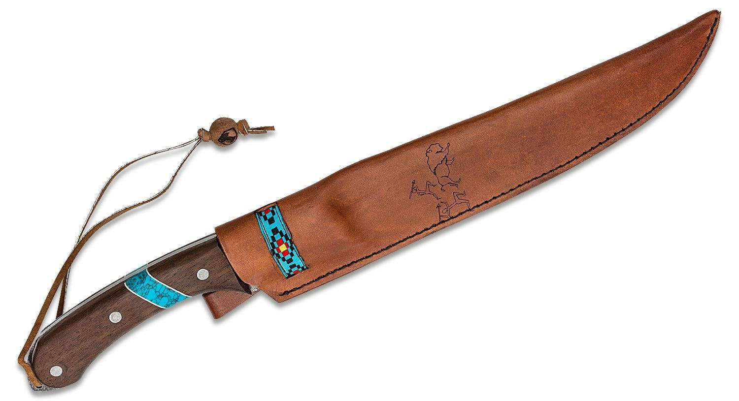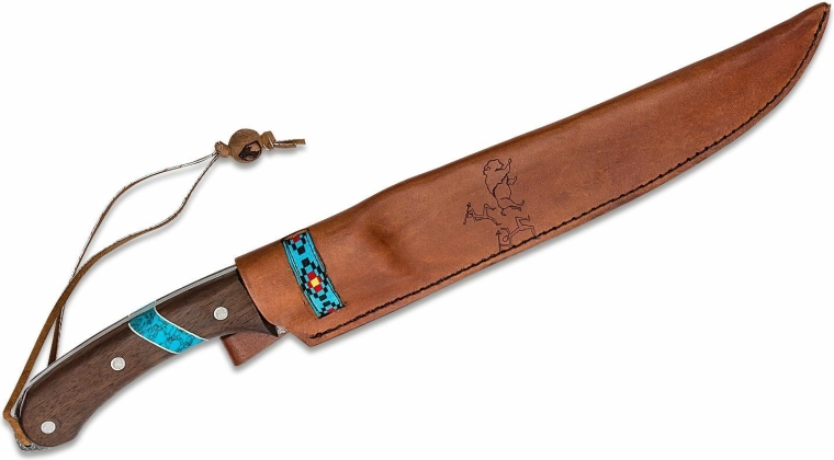 Sokoldalú, kültéri machete, a Blue River vidék ihletésével, szabadtéri munkákhoz. 1075-ös szénacélból, rusztikus felületkezeléssel, full‑tang felépítéssel a maximális szilárdságért és ergonomikus diófafából és türkiz kőből készült markolattal. A csomag része egy minőségi, díszített bőrtok is.