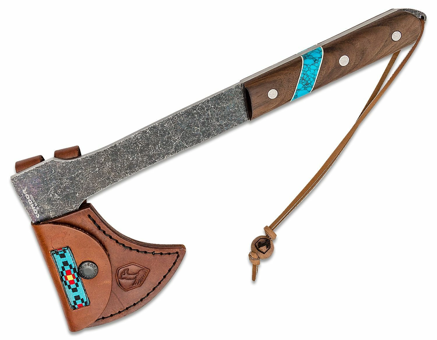 A 1075-ös szénacél fej természetes felületkezelésével és a végigfutó (full‑tang) konstrukcióval nagy szilárdságot, tartósságot és hosszú élettartamot kap. A diófa markolat dekoratív türkizkővel biztos fogást nyújt még igényes körülmények között is; a praktikus zsinórlyuk lehetővé teszi pánt hozzáadását a biztonságosabb kezelésért. A biztonságos szállításhoz a csomagban bőrtok található.