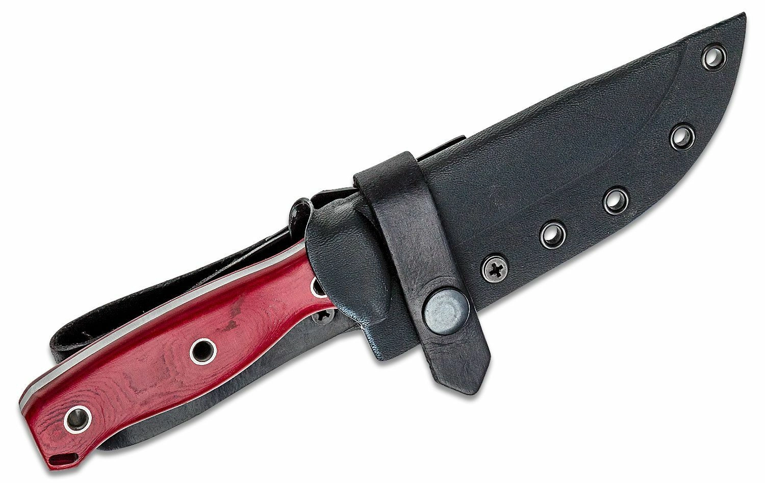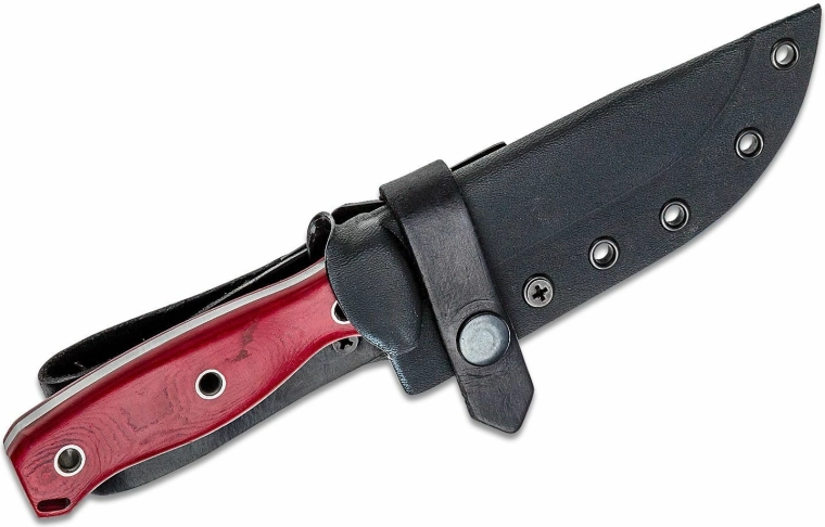 A 3D marással készült piros Micarta markolatot három üreges szegecs rögzíti, és kiváló tapadást biztosít nedves körülmények között is. A markolat hátán található kifejezett hüvelyktámaszok nagyobb biztonságot adnak a finom, precíz munkáknál. A csomag tartalma egy tartós Kydex tok, bőr elemekkel kiegészítve a kényelmes és biztonságos terepi viseléshez.