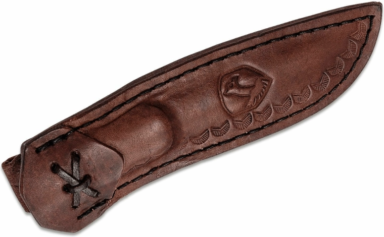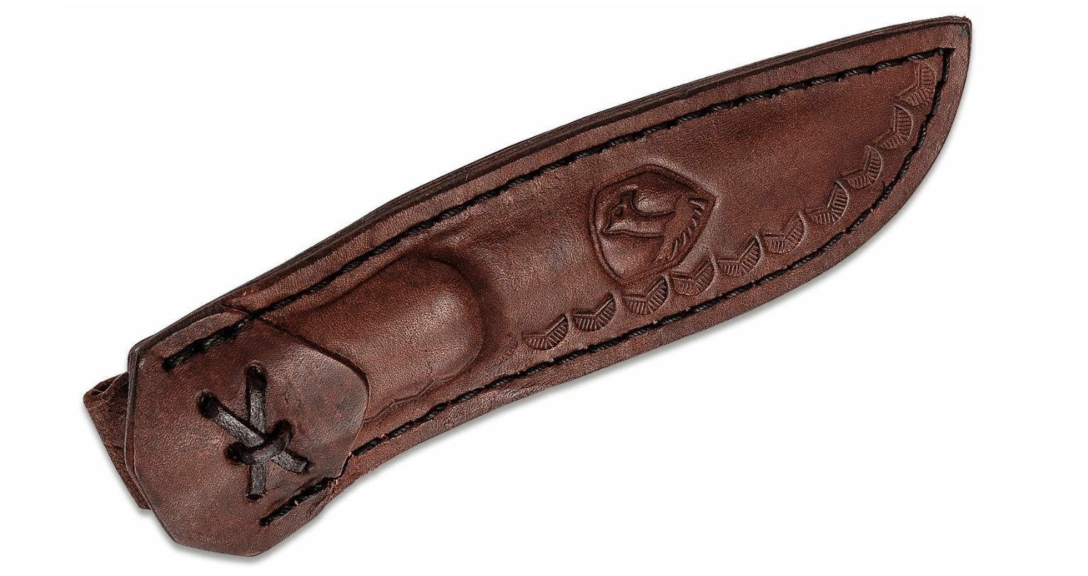 A kiváló minőségű diófából készült markolatot három sárgaréz szegecs rögzíti, és sárgaréz díszhuzal ékesíti, ami esztétikát és stabil fogást ad. A kézzel készített bőrtok kényelmes és biztonságos övtárolást biztosít, így a kés mindig kéznél van.