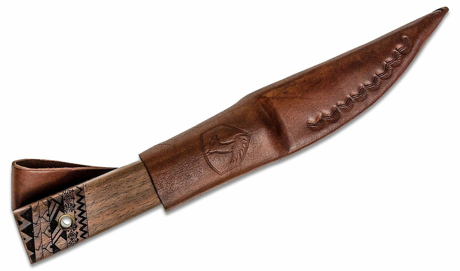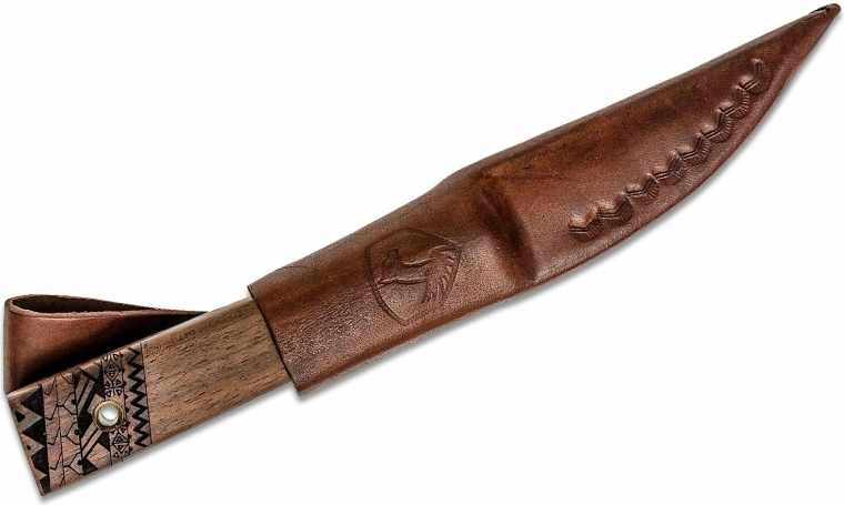 A diófa markolat remek fogást biztosít, a sárgaréz tekerés nemcsak vonzó megjelenést ad, hanem biztosabb fogást is. A végen faragott részletek és zsinórlyuk növelik a funkcionalitást és az esztétikát. A csomag része egy minőségi bőrtok az övön való biztonságos viseléshez.