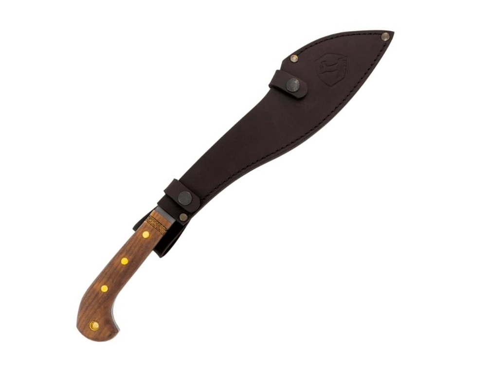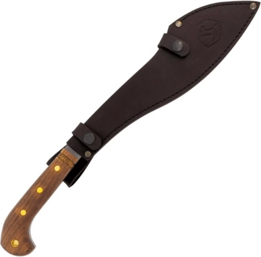 Az ergonomikus, kiszélesedő végű diófa markolat biztos fogást ad még erőteljes vágásoknál is. A bozótvágó minőségi bőrtokkal érkezik a biztonságos hordás és a gyors előrántás érdekében terepen.