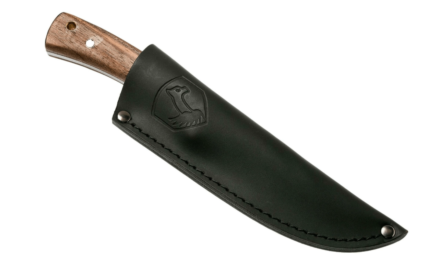 Az ergonomikus diófa markolat remekül illeszkedik a kézbe, és magabiztos fogást nyújt batonozásnál, ételek előkészítésénél és finomabb munkáknál is. A markolat végén praktikus zsinórlyuk található a biztonságosabb hordozásért. A csomag része egy minőségi, sötét kivitelű bőr tok a kés biztonságos és elegáns tárolásához.