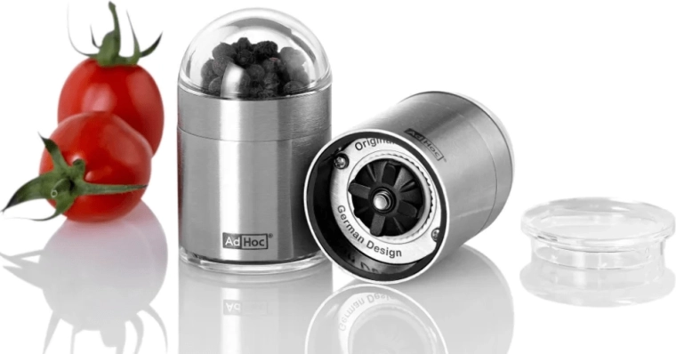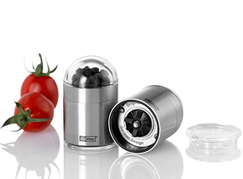 AdHoc PEKNICK miniatűr fűszer- és sóőrlő ideális utazáshoz a kompakt méretének köszönhetően. Kínál szabadalmaztatott CeraCut® kerámia mechanikát, amely ellenáll a szagoknak és a korróziónak, fokozatmentes szemcseméret-állítást, valamint átlátszó kupakot a morzsák felfogására és a fűszerek lassabb elillanására.