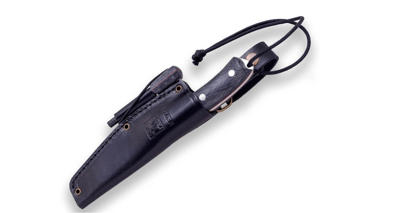 A Micarta markolat fekete kivitelben, piros elemekkel nedvesen is remek fogást ad. A kést minőségi bőrtok egészíti ki a biztonságos hordozáshoz, praktikus tűzgyújtó a tűzrakáshoz, valamint paracord (2 m) vészhelyzetekre a természetben.