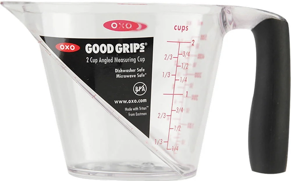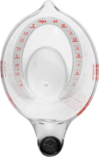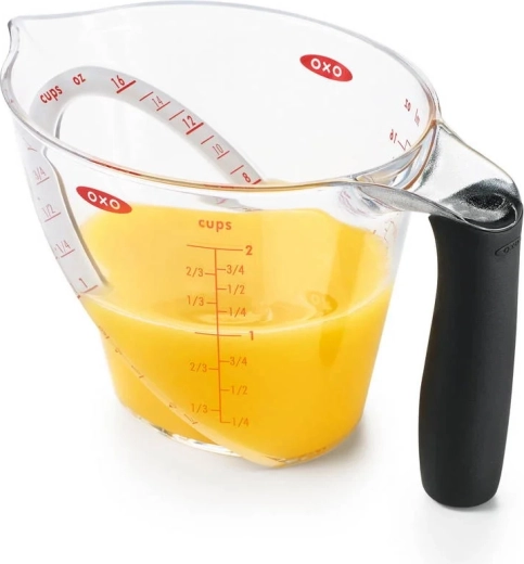 A praktikus OXO Good Grips 500 ml-es konyhai mérőedény szabadalmaztatott, ferde belső skálával rendelkezik a felülről történő könnyű leolvasáshoz, kényelmes, csúszásmentes fogantyúval és pontos, cseppmentes kiöntéssel. Tartós, átlátszó, BPA-mentes Tritan műanyagból készült, metrikus és angolszász mértékegységeket kínál, és mosogatógépben mosható.