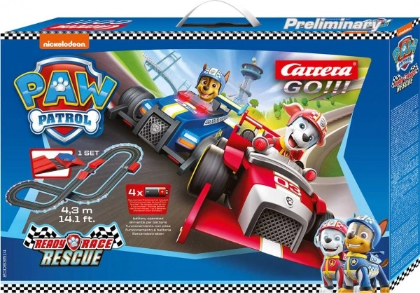 A szórakoztató CARRERA GO autópálya Mancs őrjárat témával a 5 éves kortól ajánlott gyerekeknek 4,3 m hosszú pályát kínál Chase és Marshall kisautóival. A szettben ugrató, felüljáró, egyenes és kanyargós szakaszok találhatók, az áramellátást elemek biztosítják, trafó külön megvásárolható. Kompatibilis a GO!!! autókkal és elemekkel a még több szórakozásért.