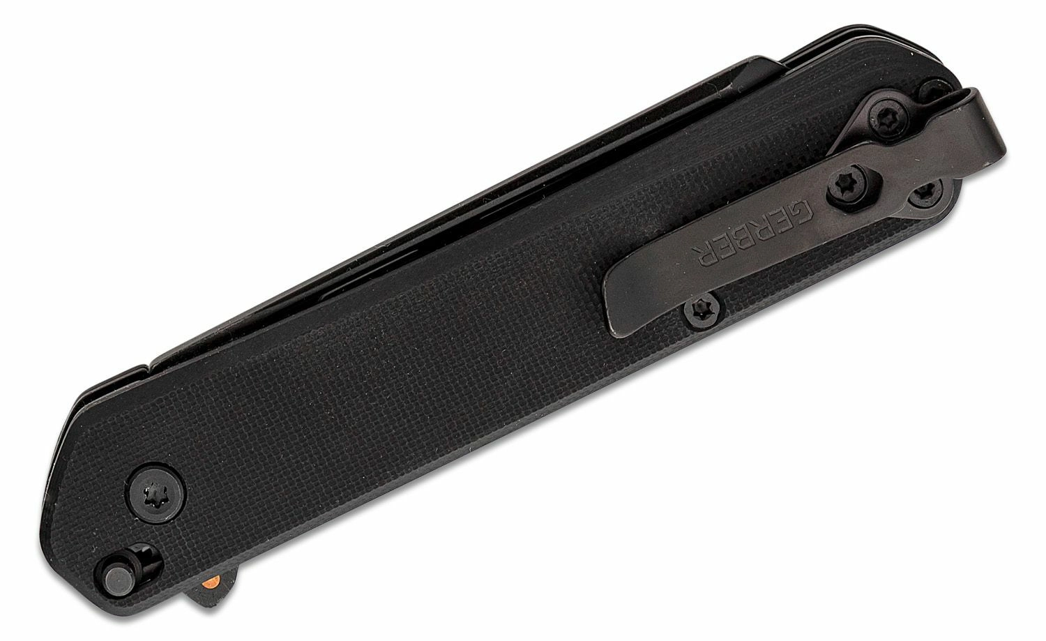 Elegáns és strapabíró EDC zsebkés, a GERBER Spire AO teljesen fekete kivitelben, gyors, rásegített nyitással flipperrel, masszív D2 acél pengével Reverse Tanto formában és könnyű, biztos fogású G10 markolattal, klippel a kényelmes hordáshoz.
