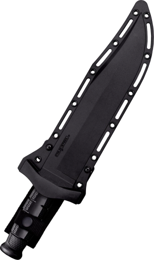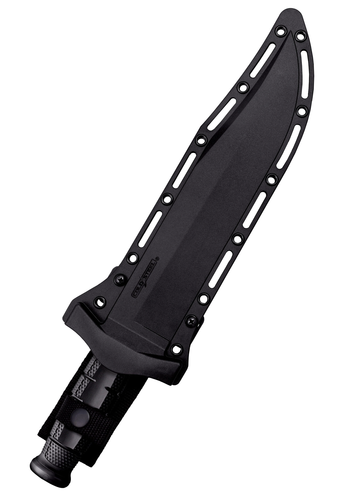 Strapabíró kültéri kés, a Cold Steel Leatherneck Bowie széles, Bowie típusú pengével D2 acélból, teljes keresztülmenő full-tang szerkezettel és ergonomikus Griv-Ex markolattal. A fekete, tükröződésmentes felület csökkenti a csillogást és növeli a tartósságot, a csomag része a többféle rögzítést kínáló Secure-Ex tok.