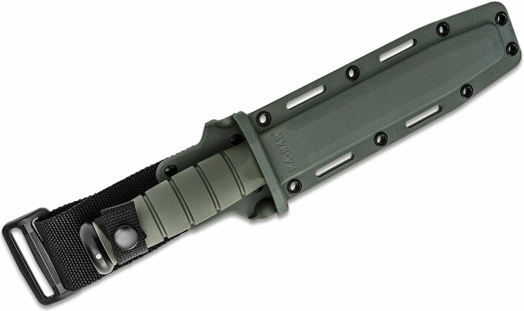 Robusztus KA-BAR taktikai kés igényes terephasználatra és szabadtéri tevékenységekhez. 1095 Cro-Van fix pengével, fekete korrózióálló felülettel, zöld csúszásmentes Kraton markolattal és műanyag tokkal a biztonságos viseléshez.