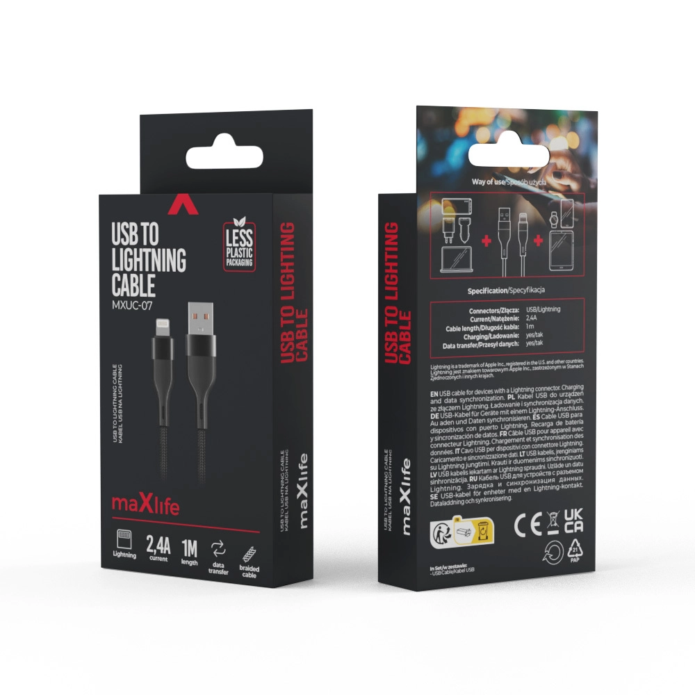 Tartós töltő- és adatkábel a Maxlife márkától USB–Lightning csatlakozással, nejlon fonott köpennyel és megerősített csatlakozókkal. Ideális gyors, 2,4 A-es töltéshez és megbízható adatátvitelhez. 1 m hossz a kényelmes, mindennapi használathoz otthon, irodában és útközben.