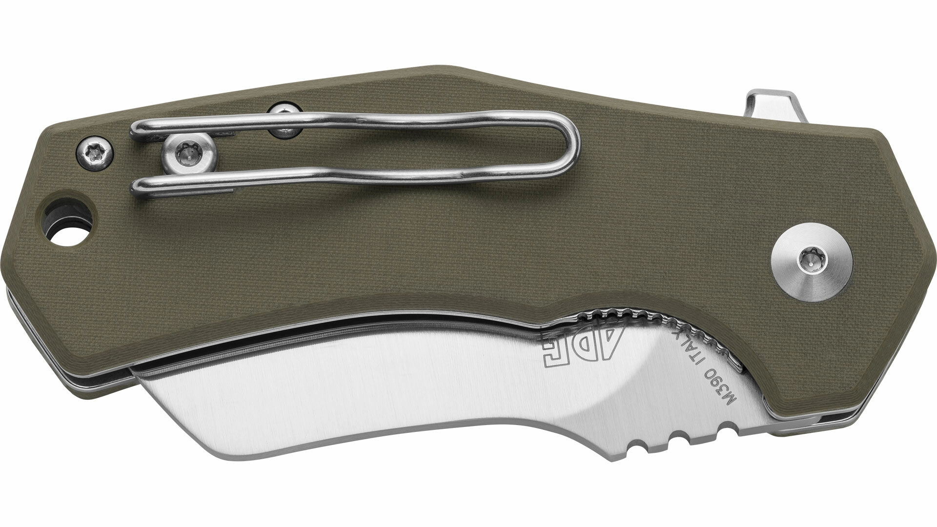 A Sheepsfoot típusú penge prémium rozsdamentes Böhler M390 acélból, szatén felülettel, kiváló élmegtartással és korrózióállósággal tűnik ki. A Flipper gyors és sima egykezes nyitást biztosít, míg a Liner Lock biztonságot ad munka közben. A texturált, zöld G10 markolat stabil fogást nyújt és nagy ellenállóképességet biztosít még igényesebb körülmények között is. A praktikus zsebklip és a zsinórlyuk megkönnyítik a hordást és a felszereléshez való igazítást.