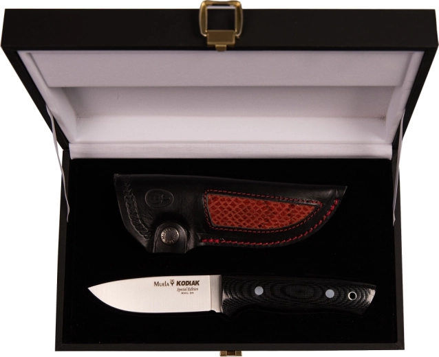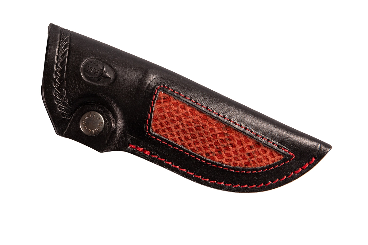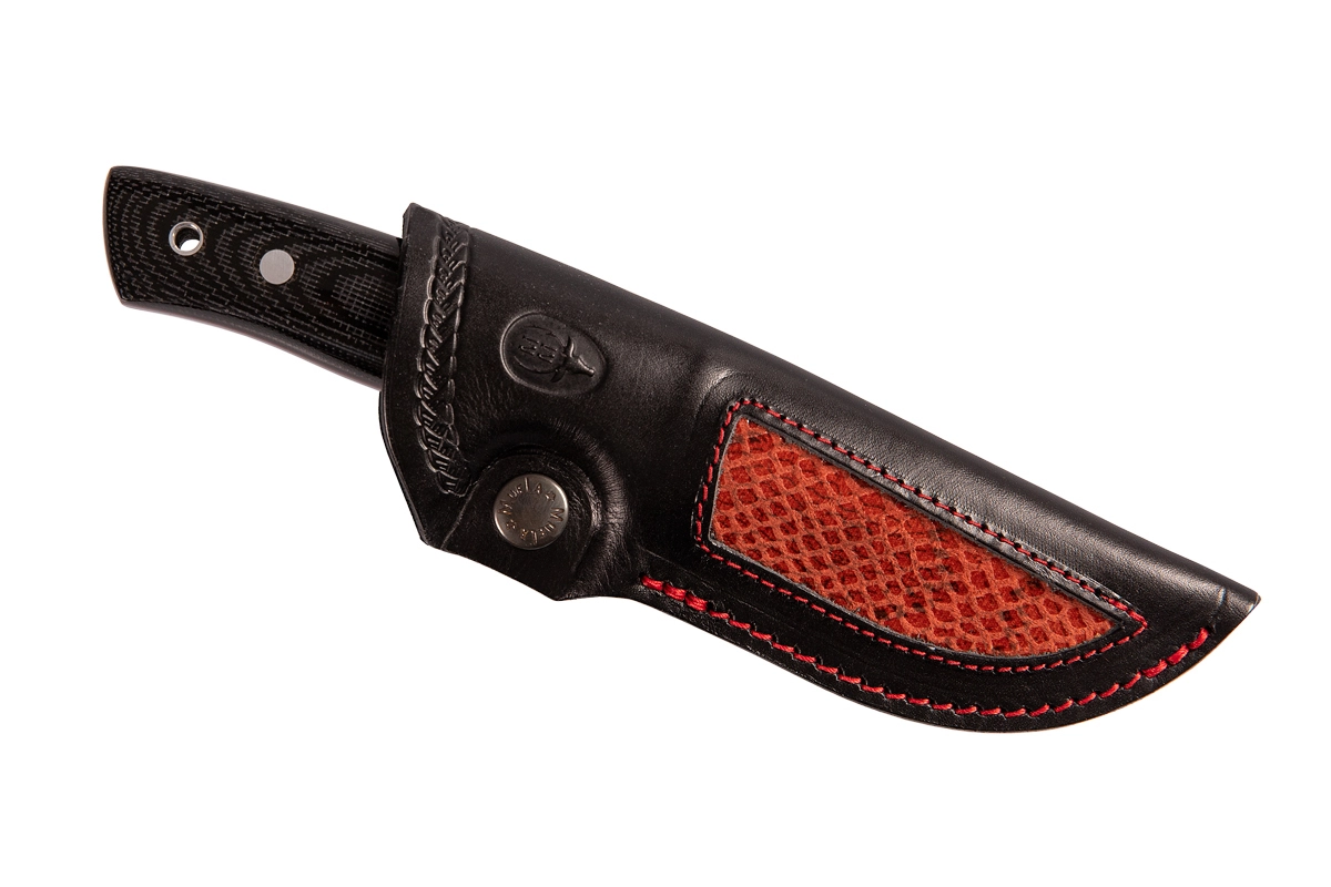 Az ergonomikus Micarta markolat fekete kivitelben, elegáns piros betéttel nedvesen is biztos fogást ad. A zsinórlyuk megkönnyíti a biztosítást vagy a felfüggesztést. A csomag része a díszített bőrtok övhurkokkal, amely biztonságos hordást és gyors hozzáférést biztosít. Ajándékdobozban szállítva – reprezentatív ajándéknak is kiváló.
