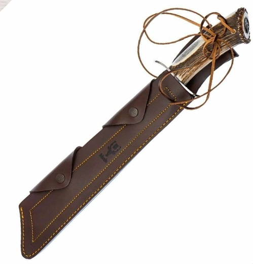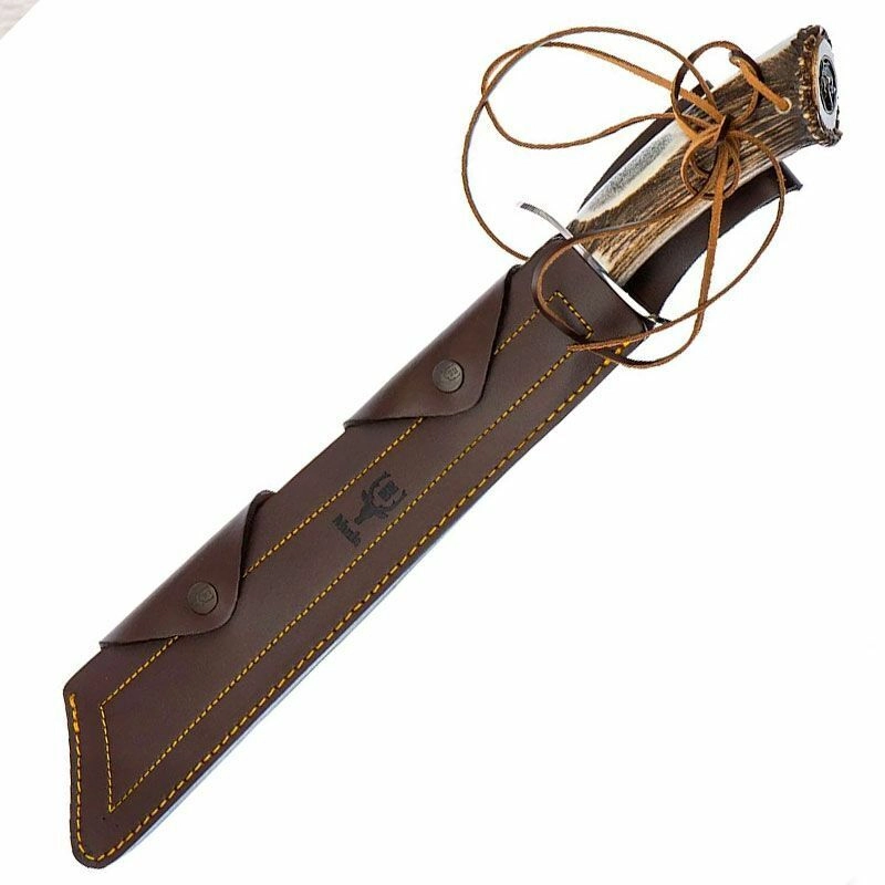 A prémium, természetes szarvasagancs markolat karaktert ad a késnek, és biztos fogást nyújt még nehéz körülmények között is. A rózsás záróvégbe illesztett, vadászmotívummal díszített fém betét egyedivé teszi a megjelenést. A mellékelt bőrtok kényelmes és biztonságos övtáskás viselést tesz lehetővé.