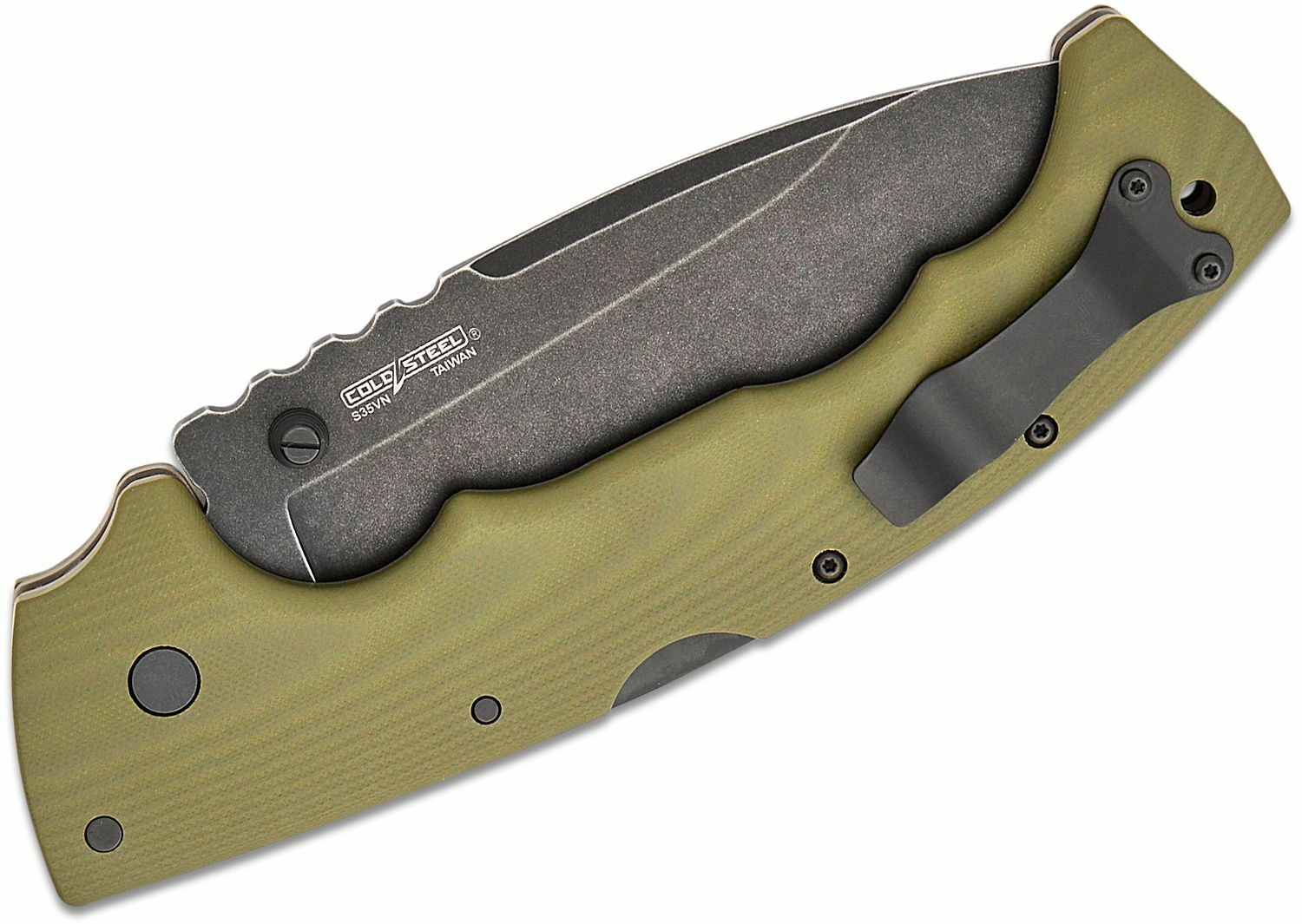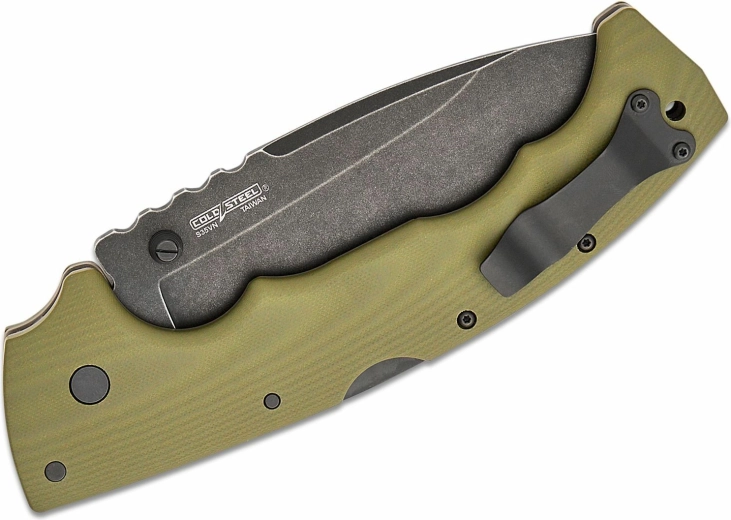 A texturált zöld G10, ujjvájatokkal, biztos fogást ad még kesztyűben is. A zsebcsipesz és a zsinórfurat megkönnyíti a mindennapi viselést.