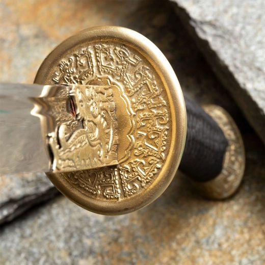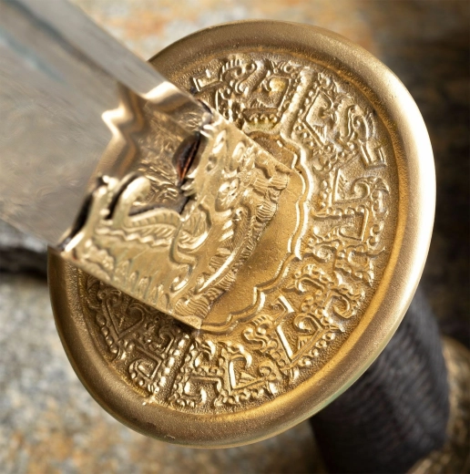 Díszített, sárkánymotívumos sárgaréz keresztvas és fekete selyemfonatú markolat a biztos fogásért és a hatásos megjelenésért.