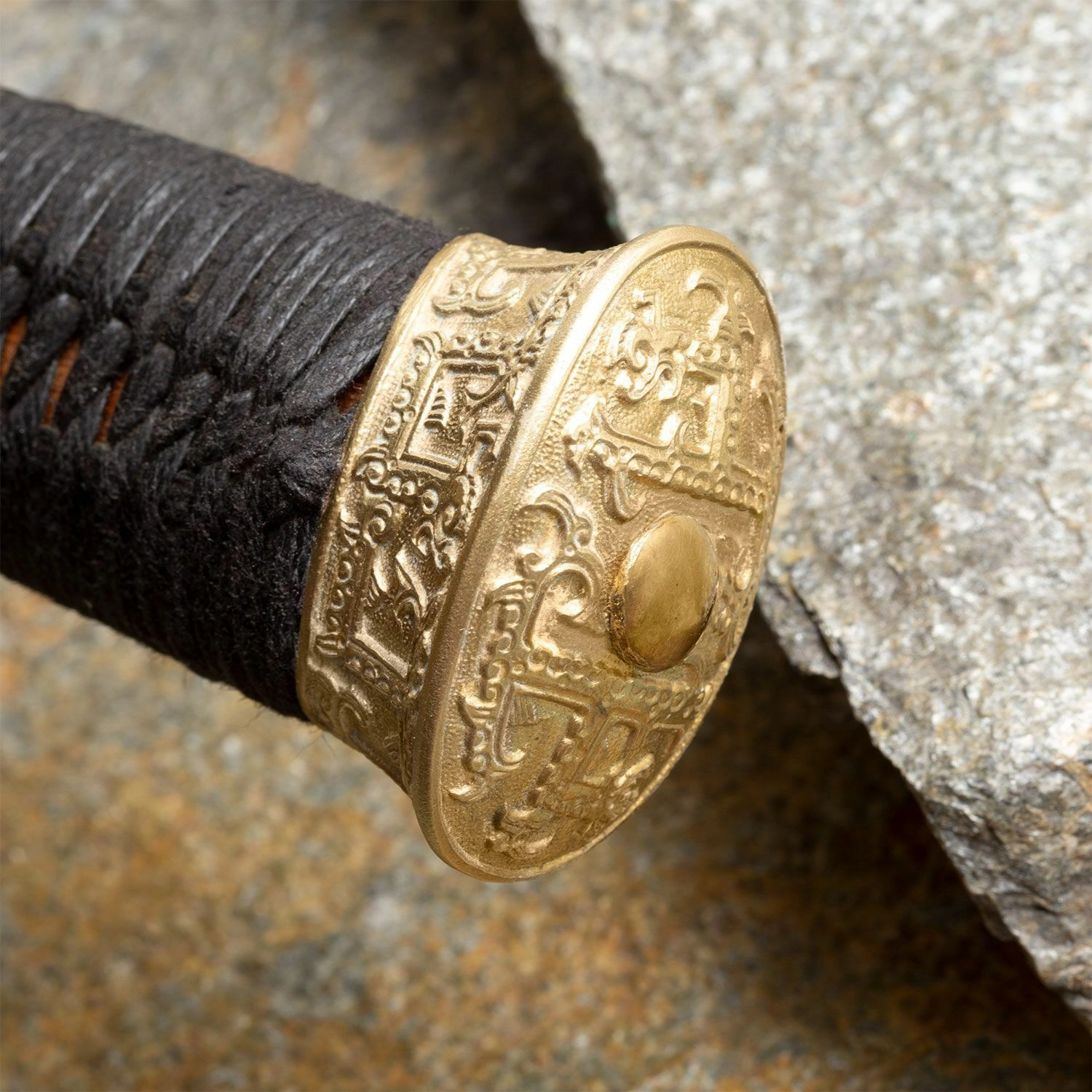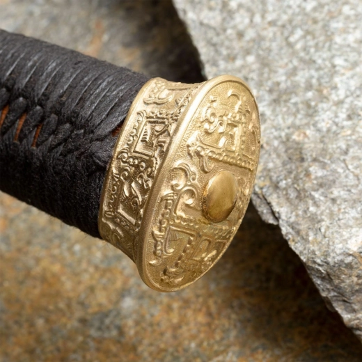 A markolat a funkcionalitást és az esztétikát ötvözi: a kör alakú, gravírozott ornamentikájú sárgaréz keresztvas védi a kezet és hangsúlyozza a történelmi jelleget. A keményfa mag erős és stabil, míg a fekete selyemfonat biztos és kényelmes fogást ad. A sárgaréz gomb a teljes fegyver kiegyensúlyozásában is segít.