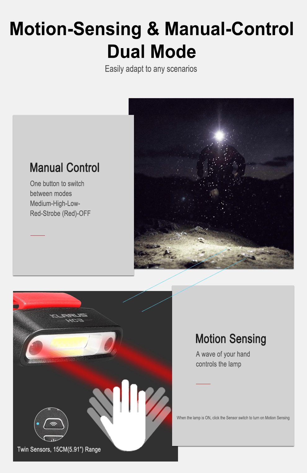 A KLARUS HC3 egy praktikus fejlámpa COB LED-del, amely széles, egyenletes fénynyalábot biztosít a biztonságos mozgáshoz és éjszakai munkához. A mozgásérzékelő lehetővé teszi a gyors be- és kikapcsolást kézmozdulattal, míg a kézi üzemmódok pontos szabályozást adnak az intenzitás felett.