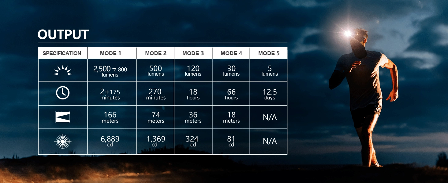 - Turbo 2500 → 800 lm / 2,5 perc + 175 perc; Magas 500 lm / 270 perc; Közepes 120 lm / 18 ó; Alacsony 30 lm / 66 ó; Holdfény 5 lm / 12,5 nap; SOS/Jelző