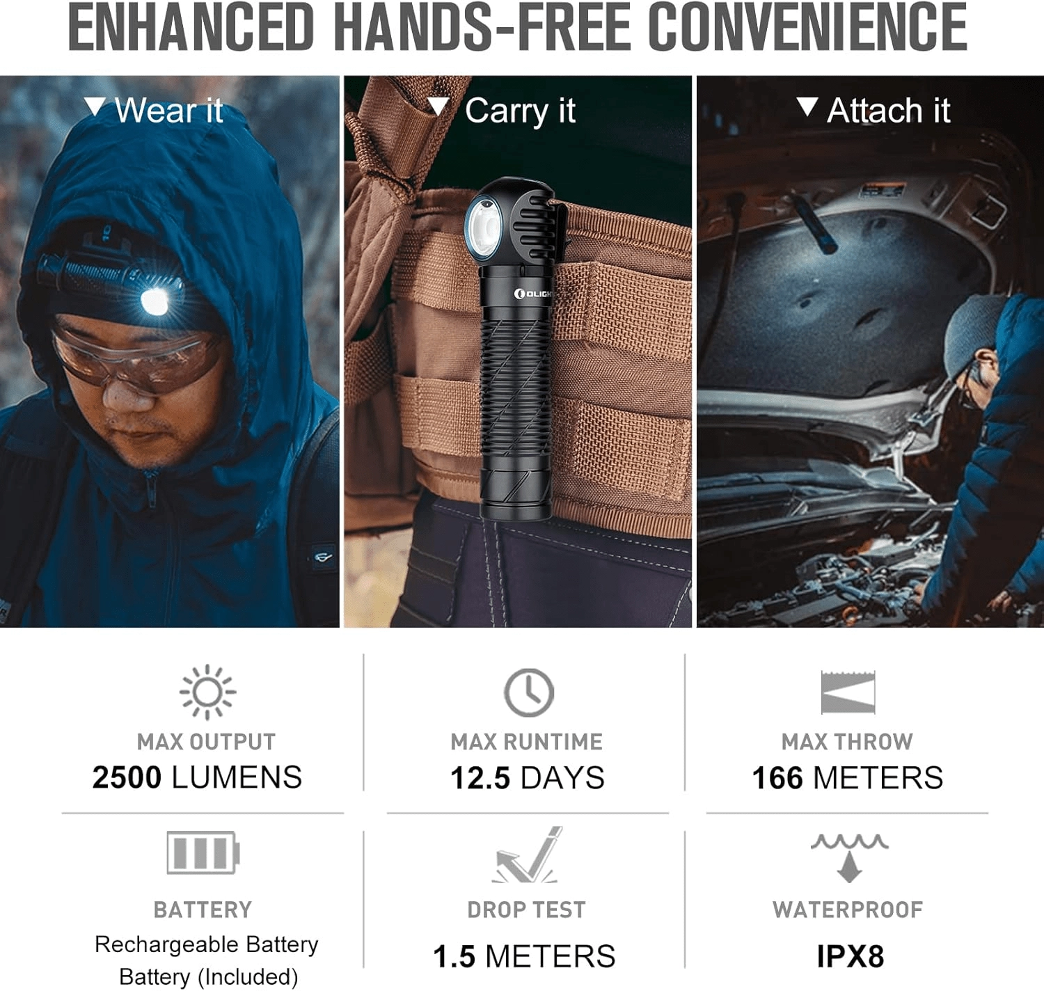 Az Olight Perun 2 a teljesítményt, a biztonságot és a kényelmet ötvözi. A derékszögű fejben lévő minőségi LED akár 2500 lumen fényerőt biztosít széles és erős fénynyalábbal, míg a közelségérzékelő automatikusan szabályozza az intenzitást, hogy elkerülje a vakítást és a túlmelegedést. A tartós, repülőgépipari alumínium ház agresszív textúrával kesztyűben is biztos fogást ad.