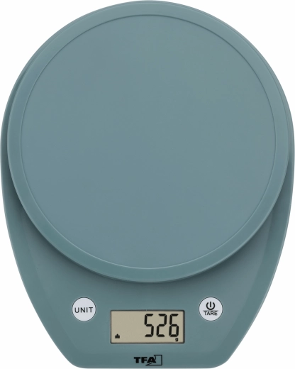 A kompakt digitális konyhai mérleg, a TFA MOCHI elegáns türkiz színben pontos mérlegelést kínál 1 g-os felbontással, jól olvasható LCD kijelzővel és a mértékegységek egyszerű váltásával a UNIT gombbal. Rendelkezik TARE funkcióval a hozzáméréshez, automatikus kikapcsolással az energiatakarékosság érdekében, valamint csúszásgátló lábakkal a stabilitásért a munkalapon.