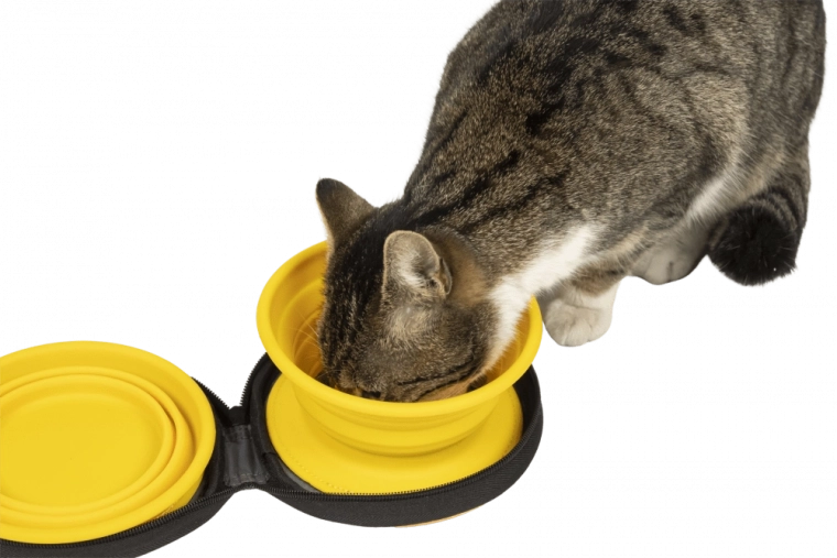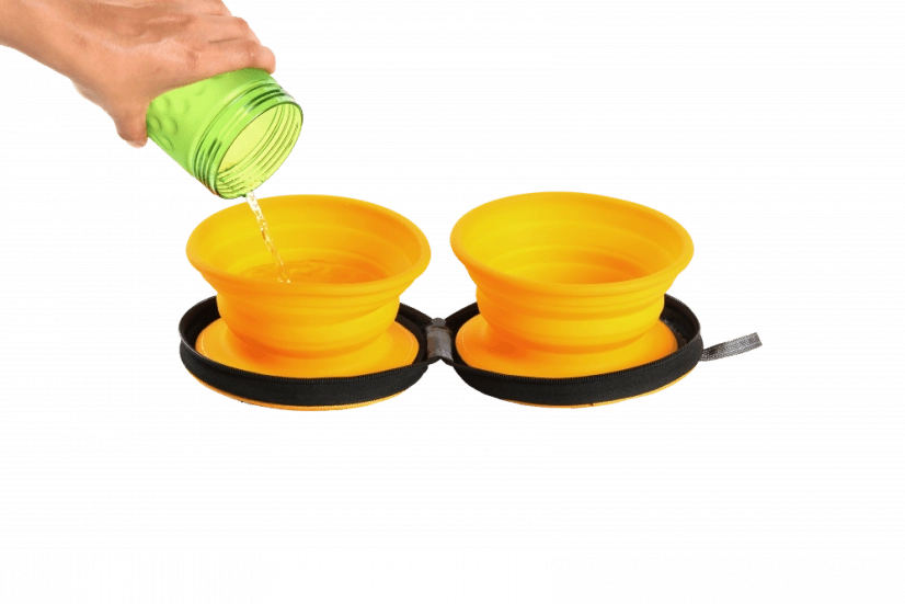 Praktikus készlet két összecsukható, kiváló minőségű szilikon tálból eledelhez és vízhez – mindegyik 350 ml űrtartalommal. A tálak tartós tokban vannak elhelyezve tépőzáras rögzítéssel és biztonságos cipzáras zárással, így könnyen szállíthatók utazás közben.
