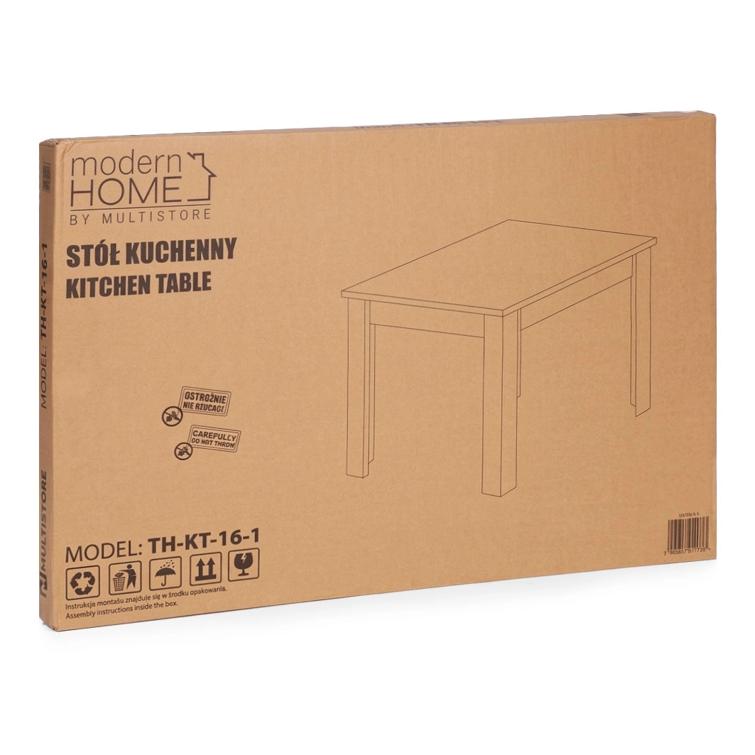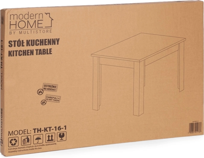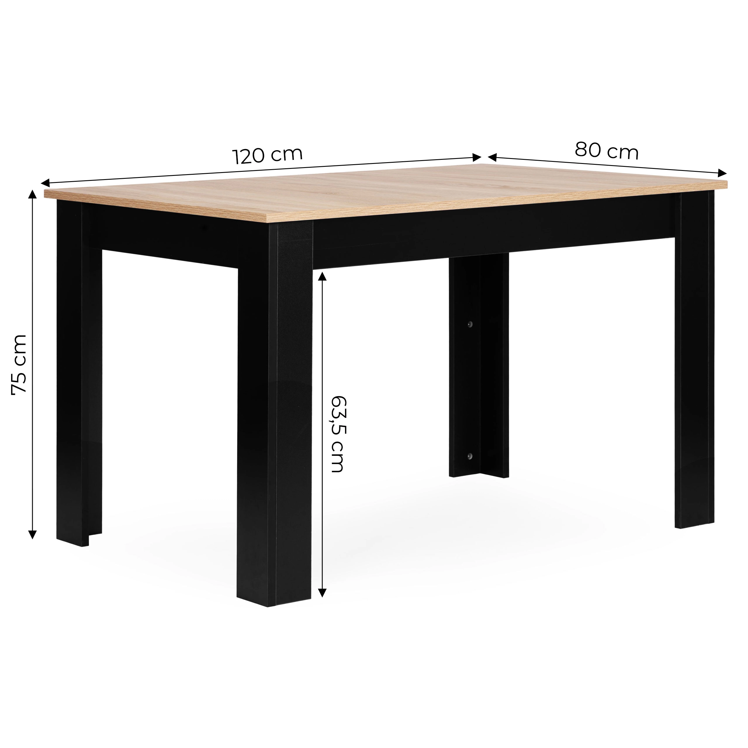 A ModernHome praktikus étkezőasztala 4 személy számára masszív, melaminnal bevont MDF szerkezettel és sonoma tölgy dekorral készül. A 120 × 80 cm-es méret elegendő helyet biztosít a mindennapi étkezéshez, karcálló, könnyen tisztítható és stabil a masszív lábaknak és a csúszásgátló talpaknak köszönhetően.