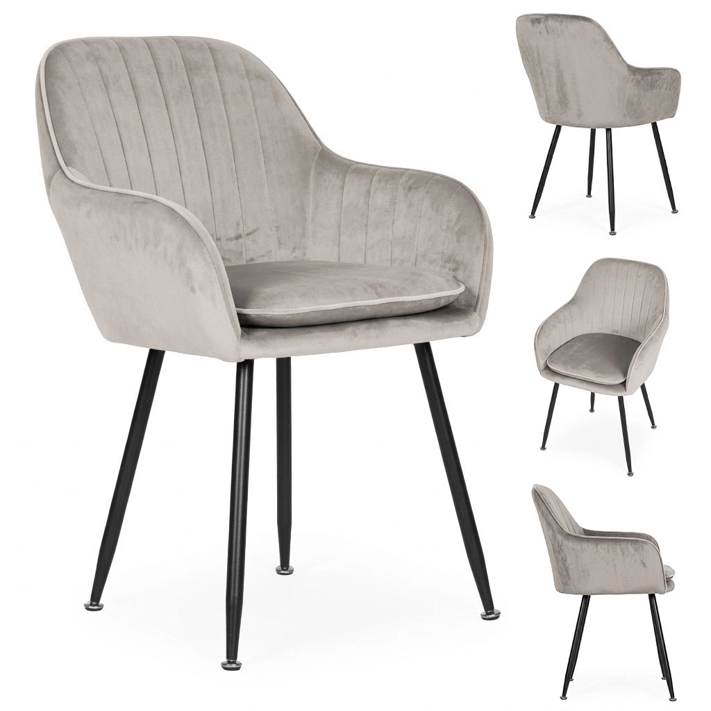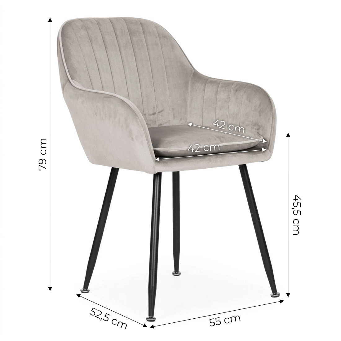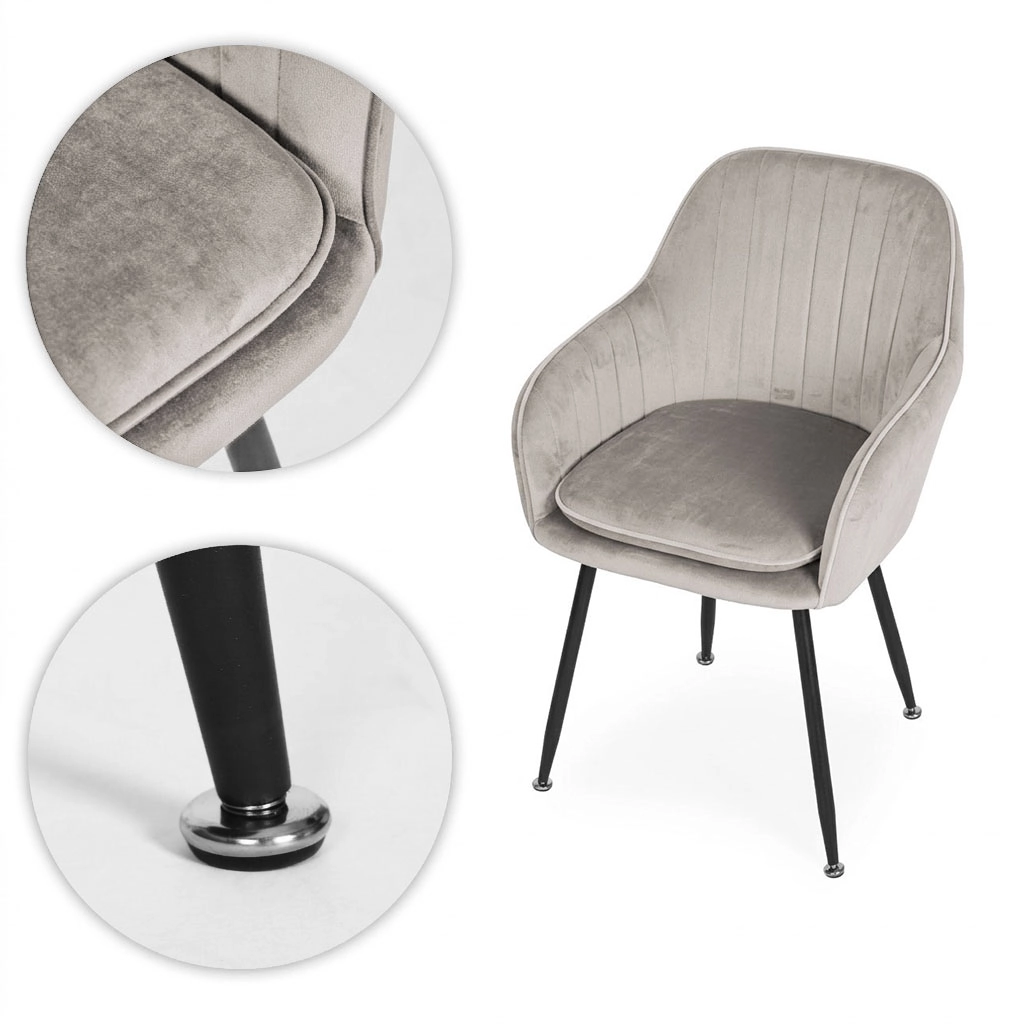 A ModernHome stílusos étkezőszéke elegáns világosszürke színben ötvözi a modern designt, a puha bársony kárpitozást és a karcsú acél lábakat a stabilitás és kényelem érdekében. A beépített kartámaszoknak, a kényelmes, PUR hab ülőfelületnek és az univerzális megjelenésnek köszönhetően kiválóan illik a modern, minimalista és glamour enteriőrökbe. Teherbírás akár 120 kg.