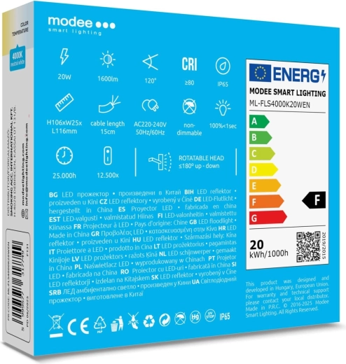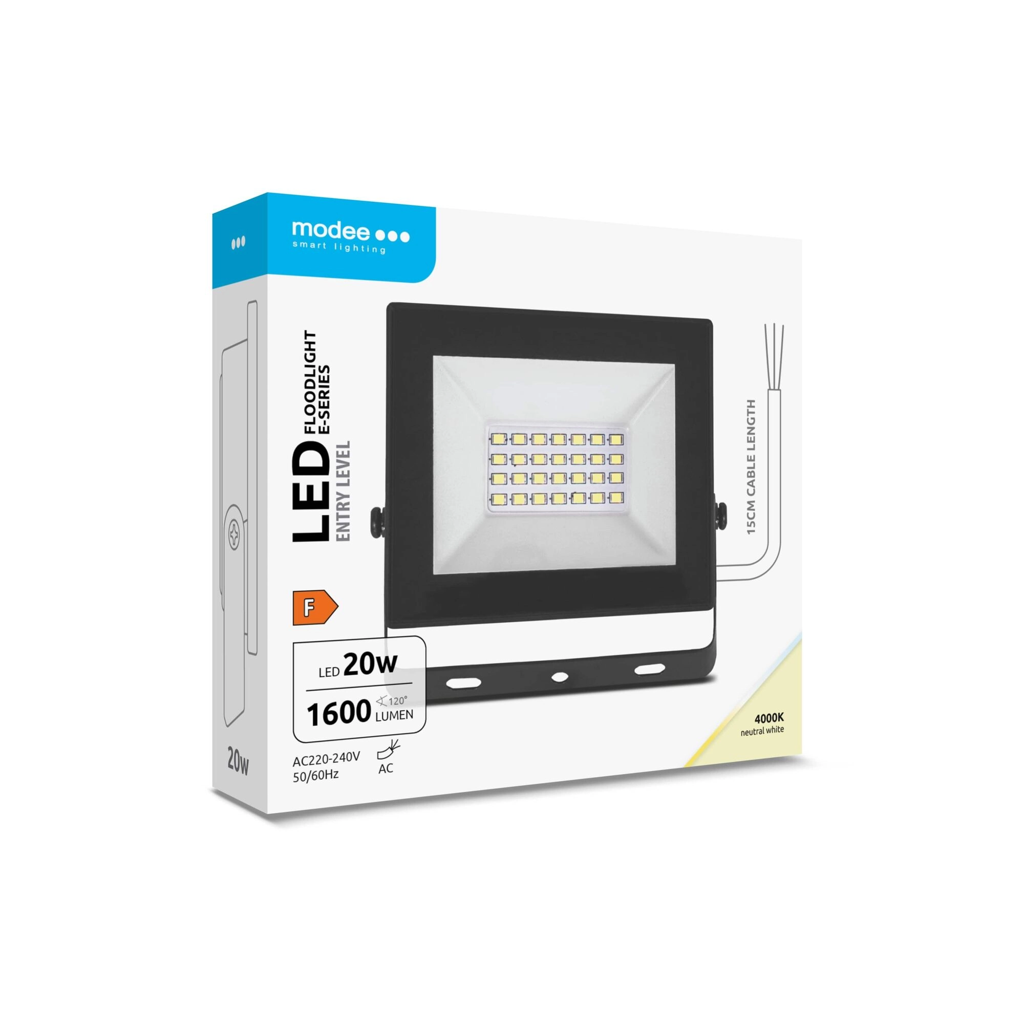 Takarékos, mégis nagy teljesítményű kültéri fényt keres? A MODEE E‑series Slim a 1600 lm magas fényáramot 20 W alacsony fogyasztással és 4000 K semleges fehér fénnyel ötvözi, amely hűen adja vissza a színeket és nem fárasztja a szemet. A széles, 120°-os sugárzási szög megbízhatóan lefedi a ház felhajtóját, egy kisebb kertet, teraszt vagy munkaterületet.