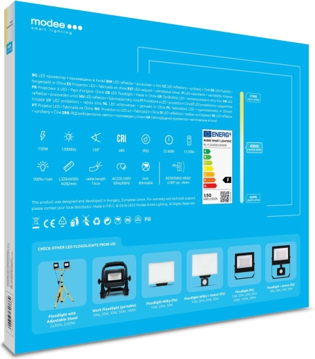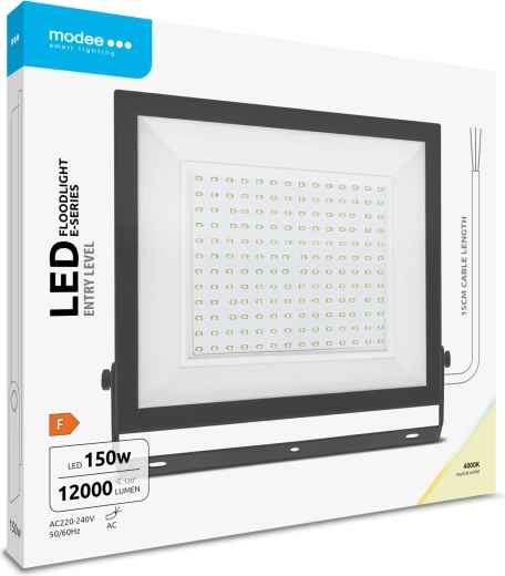 A MODEE E‑series Slim LED reflektor megbízható és energiatakarékos megoldás behajtók, udvarok, teraszok, kisebb kertek, valamint nagyobb területek – például csarnokok, raktárak vagy ipari létesítmények – megvilágítására. Ötvözi a 12 000 lm magas fényáramot a alacsony fogyasztással és a stabil, 4000 K semleges fehér fénnyel a kényelmes, színhelyes láthatóságért.