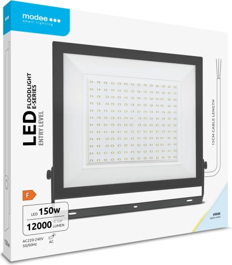 A nagy teljesítményű kültéri Modee E‑series Slim LED reflektor 150 W teljesítményt és akár 12000 lm fényáramot kínál nagy felületek fényes megvilágításához. A 120°-os széles sugárzási szögnek, az IP65 védettségnek és a 6000K hideg fehér fénynek köszönhetően ideális udvarokhoz, felhajtókhoz, raktárakhoz és ipari területekhez. A 15 cm-es tápkábel megkönnyíti a gyors és biztonságos telepítést.
