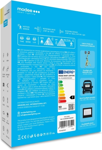 Nagy teljesítményű kültéri LED reflektor mozgásérzékelővel a Modee márkától, 4000 lm fényárammal, széles 120°-os sugárzási szöggel és kellemes semleges fehér (4000 K) fénnyel. Az IP54 védettségnek köszönhetően alkalmas bejárók, kertek, teraszok és udvarok megvilágítására, 50 W alacsony fogyasztása pedig takarékos üzemet biztosít.