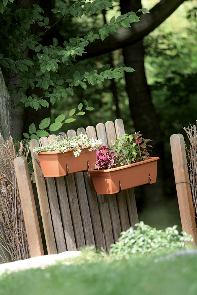 Ideális virágok és fűszernövények neveléséhez erkélykorlátokon és kerti kerítéseken. A hosszú vályú alakú ládákat stabilan a helyén tartja.
