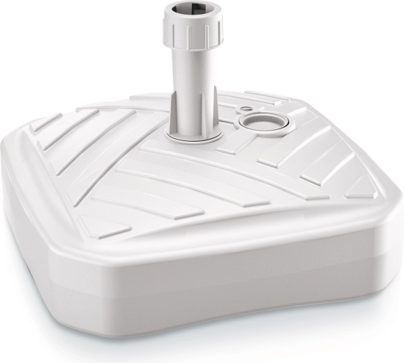 Az UMBRELLA napernyőtalp praktikus, modern négyzet formájával és fehér színével bármely kültérbe remekül illik. A rattan hatású felület elegáns megjelenést kölcsönöz, miközben könnyen tisztán tartható. A tartós műanyagnak köszönhetően ellenáll a napsugárzásnak és az esőnek, míg a legfeljebb 12 liter vízzel vagy homokkal való feltölthetőség a szükséges stabilitást adja szelesebb időben is.