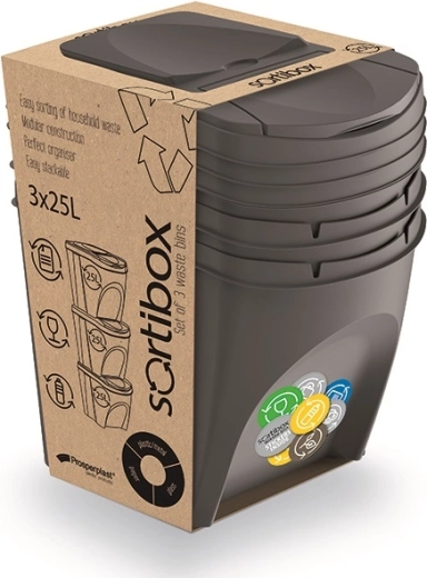 3 darabos Sortibox szelektív hulladéktároló készlet, szürke kő, 3×25 l