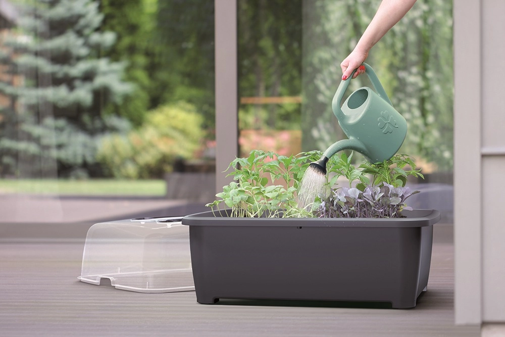 A praktikus, 1,8 literes locsolókanna alacsony tömeget párosít magas tartóssággal. A hosszú kiöntőnek és a levehető szórófejnek köszönhetően az öntözést könnyen a növények igényeihez igazíthatja – a pontos vízsugártól a finom esőig palánták és fűszernövények számára.