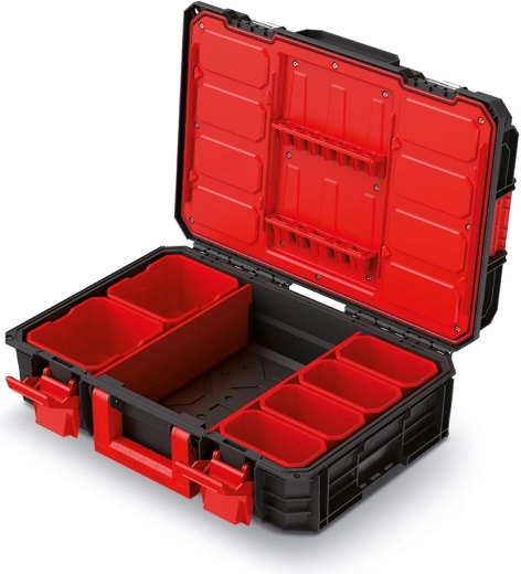 A masszív X‑BLOCK PRO szerszámos koffer olyan profiknak készült, akik megbízható és tartós szerszámtárolást igényelnek. A moduláris rendszer révén több koffer könnyen összekapcsolható reteszelő elemek segítségével, míg a bordázott szerkezet nagyfokú ellenállást biztosít a mechanikai sérülésekkel szemben a mindennapi használat során is.