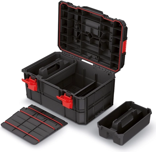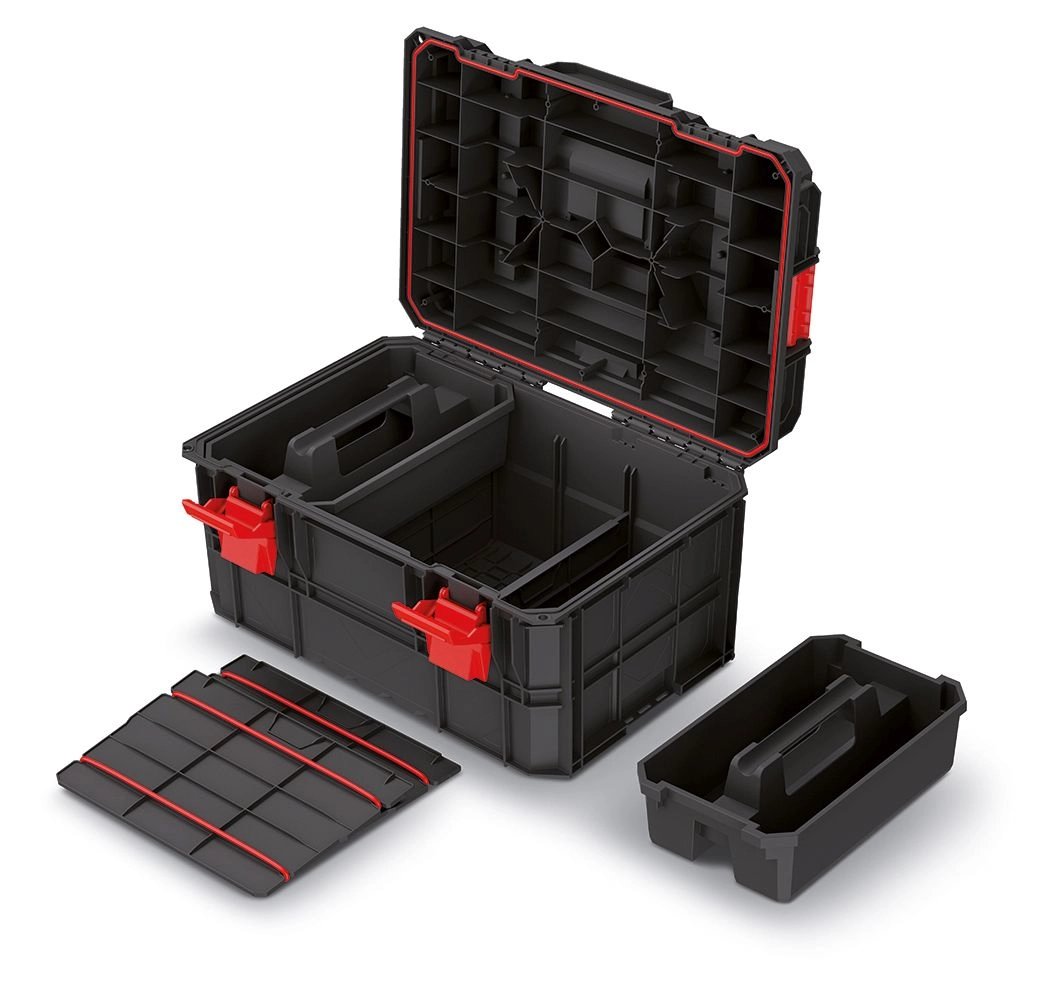 Az X BLOCK moduláris rendszer lehetővé teszi a dobozok biztonságos összekapcsolását reteszelő mechanizmusokkal és az egyszerű egymásra rakást. A koffer nehéz szerszámok szállítására alkalmas, magas teherbírást kínál, valamint átgondolt belső teret betétekkel és rekeszekkel a gyors rendszerezéshez.