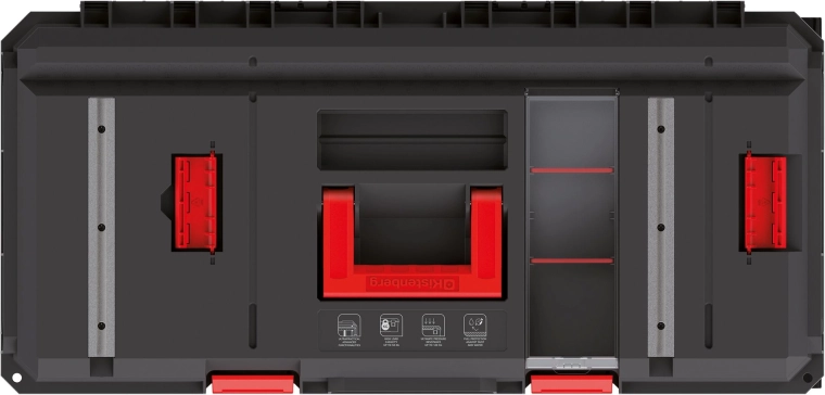 A bordázott merevítések és a fedéltömítés megóvják a szerszámokat a portól és a nedvességtől. Ideális az igényes építkezési körülményekhez és a műhelybe is.