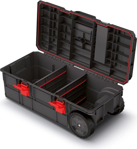 Professzionális, gurulós szerszámos bőrönd a X-BLOCK TECH sorozatból a maximális tartósságért és kényelmes szállításért. Masszív felépítést, por- és vízálló tömítést, moduláris összekapcsolást és fedélbe integrált rendezőket kínál. A nagy kerekeknek és a kihúzható húzófogantyúnak köszönhetően a nehéz szerszámok is könnyen mozgathatók, miközben a bőrönd akár 50 kg teherbírást és akár 120 kg közvetlen terhelést bír.