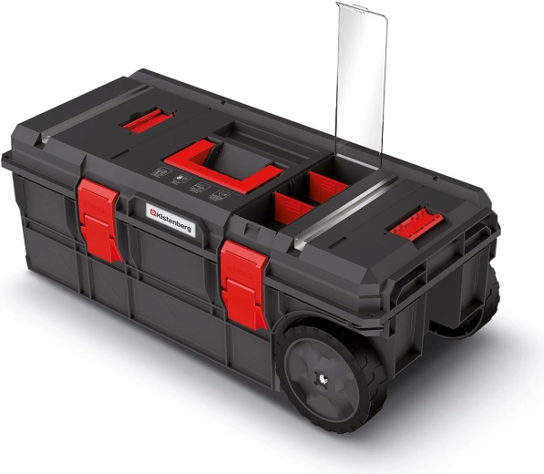 Két masszív kerék és a kihúzható húzókarral ellátott fogantyú lehetővé teszi a nehéz szerszámok erőfeszítés nélküli mozgatását.