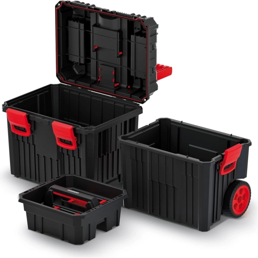 A belső tér okosan kialakított: található benne kivehető kosár, csavarhúzótartó és rekeszek az átlátható szerszámtároláshoz. A fedélben átlátszó rendezők vannak integrálva polikarbonát fedéllel és kivehető válaszfalakkal az apró alkatrészekhez. A strapabíró ABS csatok biztonságosan zárva tartják a bőröndöt szállítás közben.