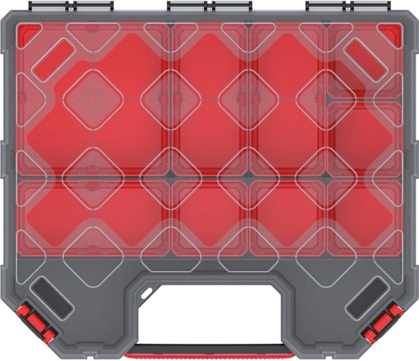 Praktikus szekrény 5 kivehető szervezővel, amely hatékony rendszerezést kínál apró tárgyakhoz, alkatrészekhez és szerszámokhoz. A átlátszó fedeleknek köszönhetően azonnali rálátása van a tartalomra, míg az ergonomikus fogantyú megkönnyíti a hordozást. A erős műanyagból készült tartós test hosszú élettartamot biztosít, a stócolás vagy falra szerelés lehetősége pedig helyet takarít meg a műhelyben és otthon is.