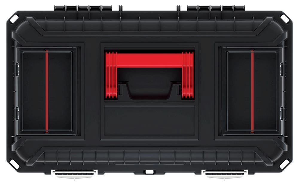 A felső fedél praktikus külső rekeszekkel rendelkezik csavarokhoz, bitekhez vagy szegekhez, belül pedig kivehető betét található a kisebb elemek jobb rendszerezéséhez. A kényelmes műanyag fogantyú megkönnyíti a mindennapi kezelést és szállítást.