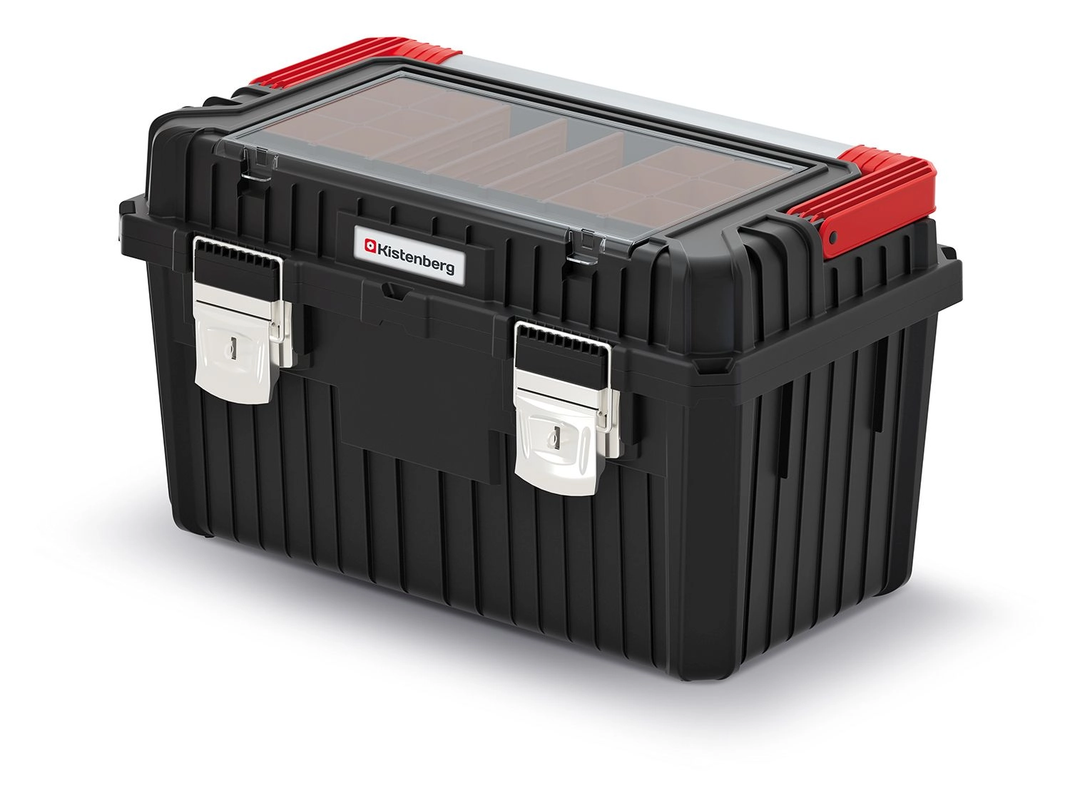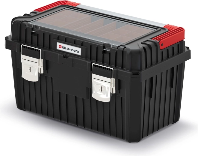 A robusztus, fekete Heavy szerszámos láda mindennapos műhely- és szerelési használatra készült. A fém elemek hosszú élettartamot és biztonságos hordozást garantálnak, a felső rendszerező átlátszó fedele (változattól függően) pedig gyors rálátást ad az elhelyezett apróságokra.