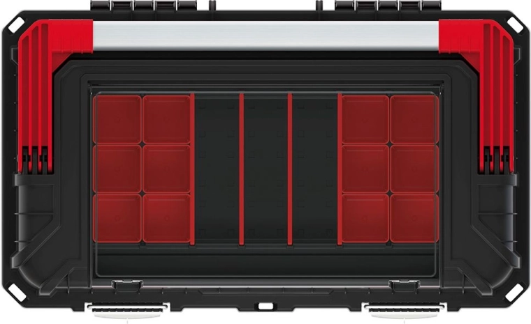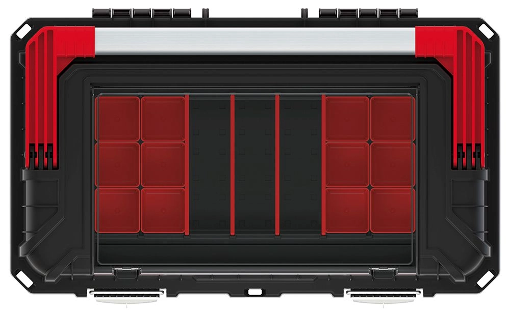 Átgondolt belső elrendezésének, a kivehető betétnek és a külső rekesznek köszönhetően könnyedén szétválogathatja a szerszámokat és a fogyóanyagokat. A masszív reteszek megbízhatóan zárva tartják a fedelet, így a tartalom szállítás közben is biztonságban marad.