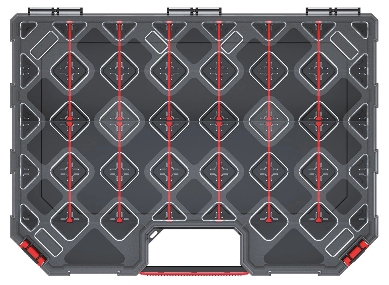 Praktikus, magas TAGER CARBO PLUS rendező állítható válaszfalakkal az eszközök és apró kötőelemek áttekinthető tárolásához. A átlátszó polikarbonát fedélnek köszönhetően mindig szem előtt van a tartalom, a masszív kialakítás tartósságot biztosít, az átgondolt tagolás pedig rendet garantál az elemek keveredése nélkül.