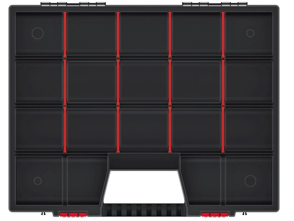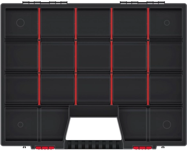 A praktikus NOR műanyag rendszerező 490 × 390 × 65 mm-es mérettel 18 állítható rekeszt kínál az apró alkatrészek és szerszámok áttekinthető tárolásához. A áttetsző fedél lehetővé teszi a gyors tájékozódást felnyitás nélkül, míg a 2 masszív zár és az ergonomikus fogantyú biztonságos és kényelmes szállítást biztosít. A tartós műanyag kivitel hosszú élettartamot garantál még gyakori használat mellett is.